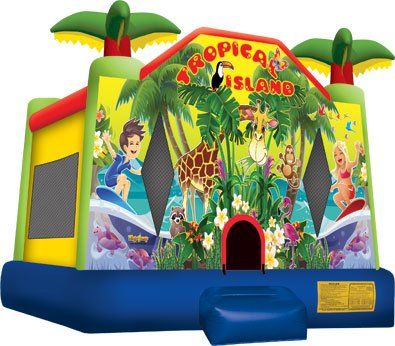 this adventure awaits with this tropical island bouncy house. Each visitor is greeted by plenty of colorful exotic animals, and even a pair of young surfers as they take off for an afternoon of bouncing. A perfect way to combine fun and healthy activity for only $ 130.00